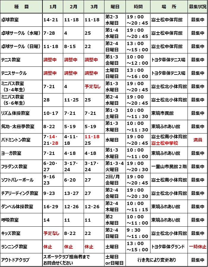 開催日について ➣開催曜日、場所は変更する場合がございます。以下のスケジュール表をご確認の上、参加をおねがいします ➣スケジュール表内の「未定」「調整中」については決定しだい最新の情報に更新しますので今しばらくお待ちください 【R8年度 1月~3月】 【R7年度 10月~12月】