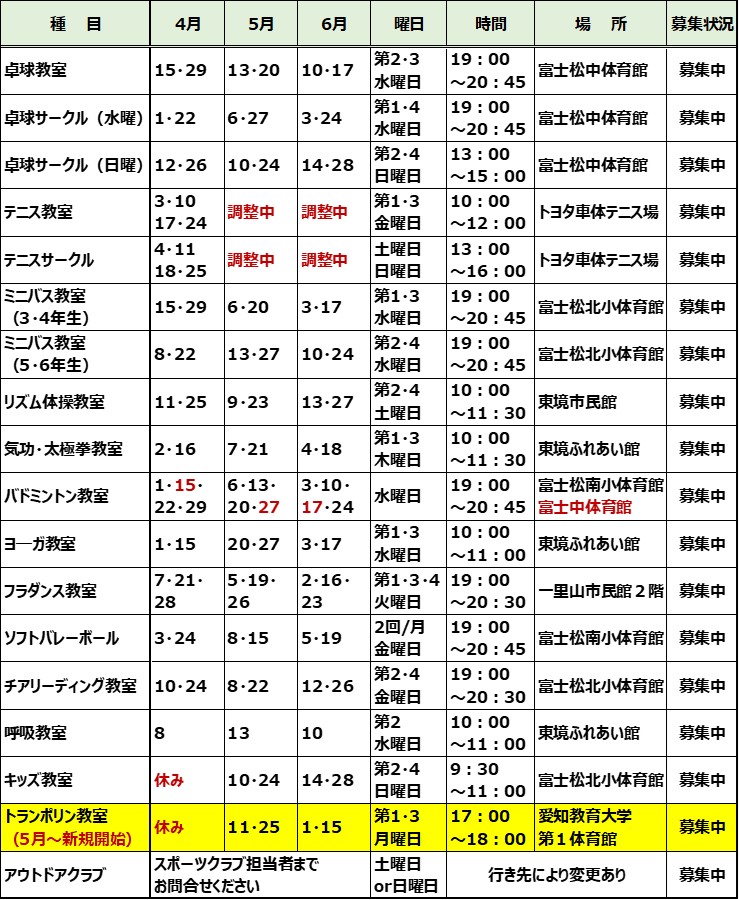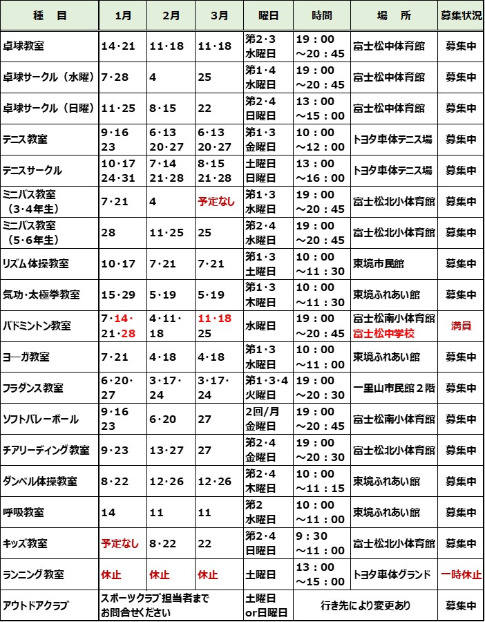 開催日について ➣開催曜日、場所は変更する場合がございます。以下のスケジュール表をご確認の上、参加をおねがいします ➣スケジュール表内の「未定」「調整中」については決定しだい最新の情報に更新しますので今しばらくお待ちください 【R8年度 4月~6月】 【R7年度 1月~3月】